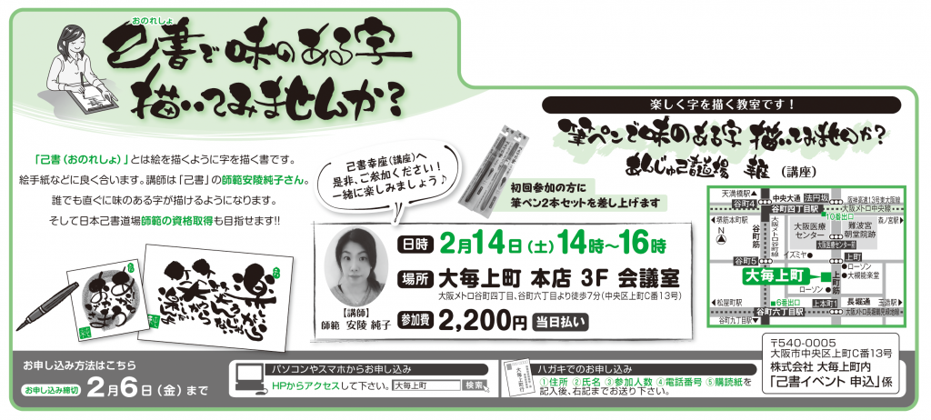 イベント内容 「己書(おのれしょ)」とは絵を描くように字を描く書です。絵手紙などに良く合います。